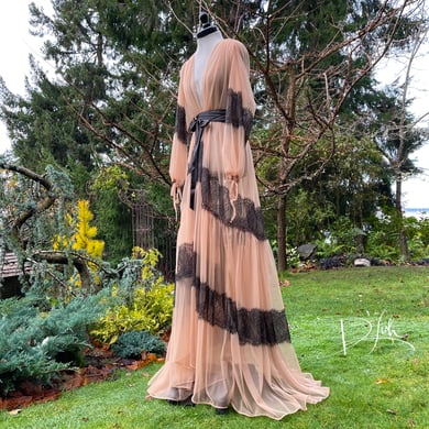 Black & Light Mocha "Elisabeth" Sheer Dressing Gown w/ Lace PRE-ORDER FOR NOVEMBER