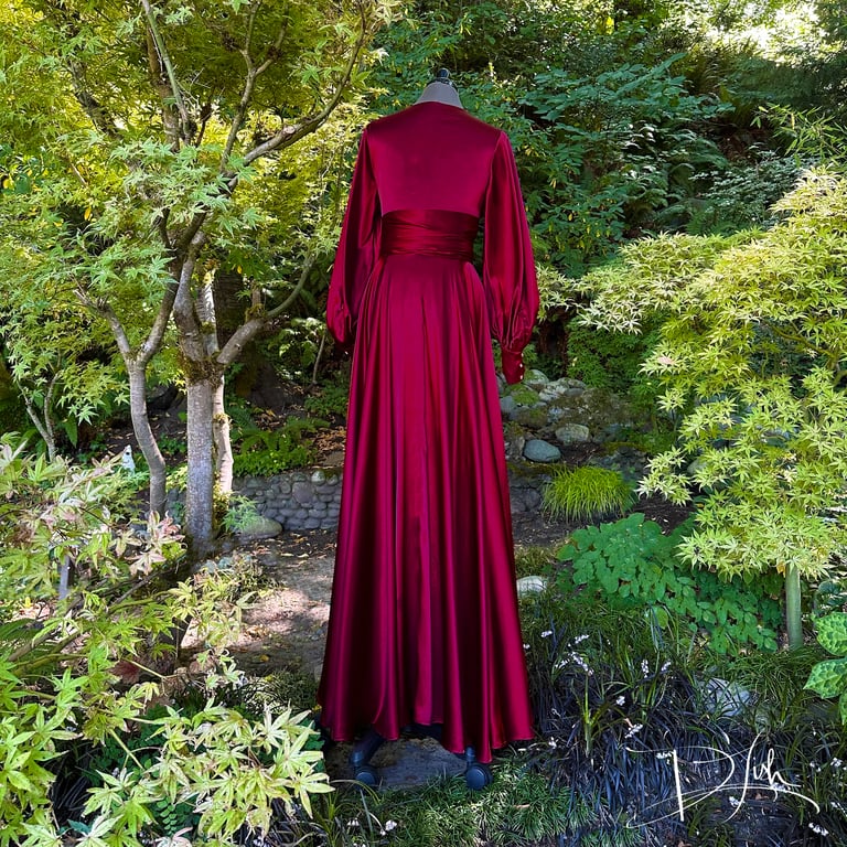 The Beverly dressing gown embodies pure extravagance with dramatic sleeves and fitted cuffs for a classic boudoir feel reminiscent of Hollywood’s golden era. The skirt is extremely full, and the three large crystal buttons on each cuff perfectly enhance the luxuriousness of the fabric. The soft, sleek charmeuse drapes beautifully around the bodice, and nips in at the waist with a sexy sash. Pure decadence both inside and out, the gown is lined with the same delicious charmeuse on the inside, and the sensuously sweeping skirt is a full circle shape, ideal for impromptu dance numbers around the house! All this and pockets too!
